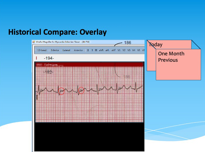 Detecting ST elevation can be challenging when the ECG is oriented in a normal, right-side-up fashion. The MI Viewer can rotate the ECG 90 or 180 degrees, allowing the eye to identify an ST elevation in a horizontal or inverted orientation more easily than in a standard presentation. Additionally, the MI Viewer can overlay previous ECG tracings and allows for scrolling through previous and current ECGs simultaneously, enabling providers to compare readings for a more accurate and comprehensive picture of a patient’s heart condition.