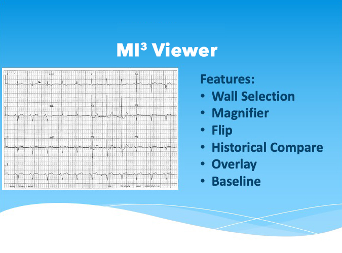 The MI Viewer system displays the ECG data arranged together such that the data representing each heart wall are presented sequentially and in isolation, allowing for a more intuitive evaluation of the lead display. It guides the physician through the sequence of steps to perform a more accurate systematic visual scan of the ECG lead signals.