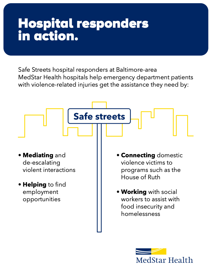Hospital responders work with other members of the Safe Streets team, as well as social workers, to help patients and community members access employment assistance, skills training, domestic violence counselors, and programs to secure food, transportation, and housing.