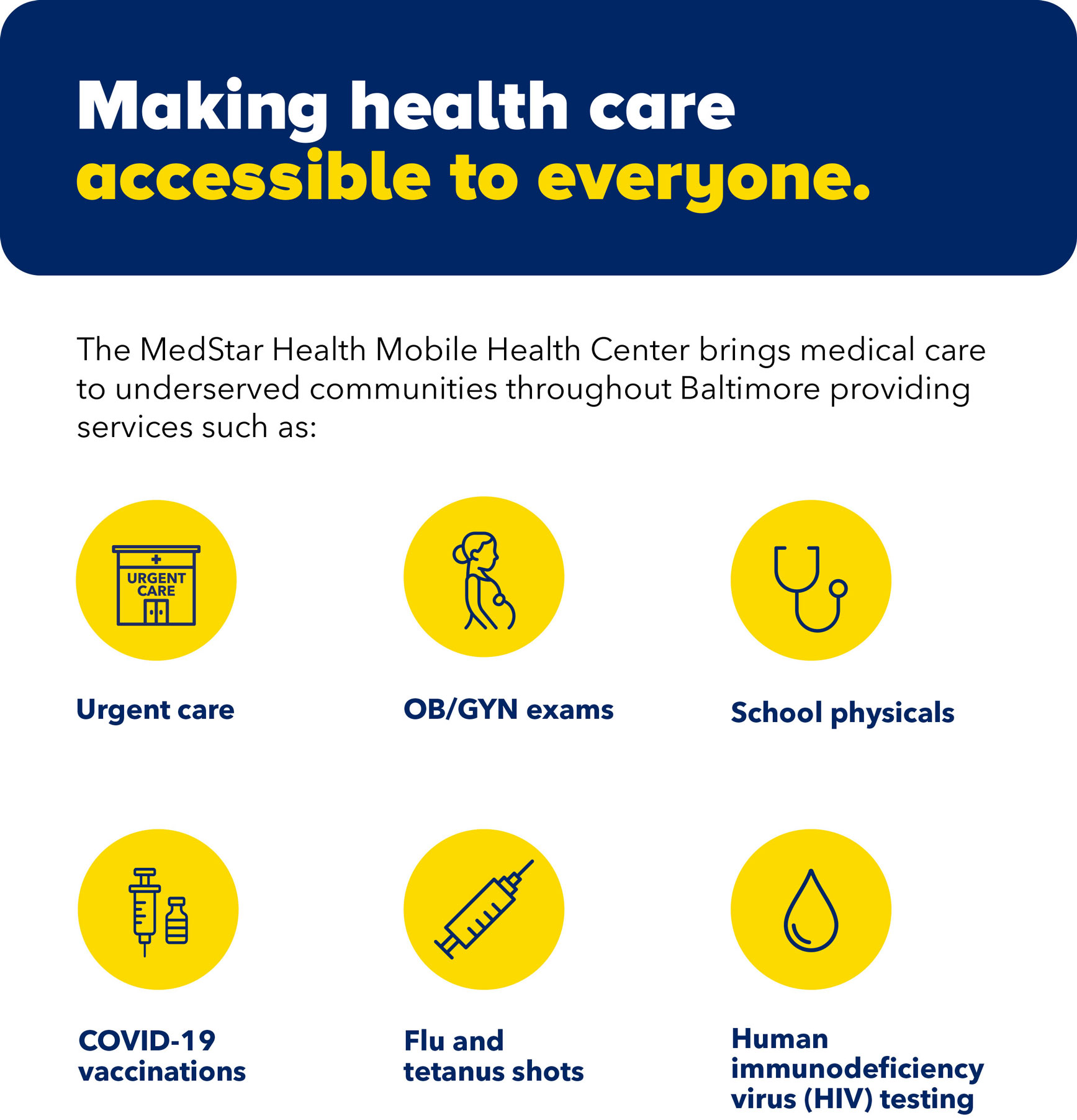 The MedStar Health Mobile Health Center provides quality care to underserved communities around MedStar Harbor Hospital in Baltimore. Community members can stop by the mobile center to receive various medical services, such as urgent care, primary care, wellness and OB/GYN exams, human immunodeficiency virus (HIV) testing and education, flu and tetanus shots, school-required athletic physicals, and referrals for substance- abuse treatment. It operates four days a week and makes eight stops throughout South Baltimore, including local schools and community recreation centers.